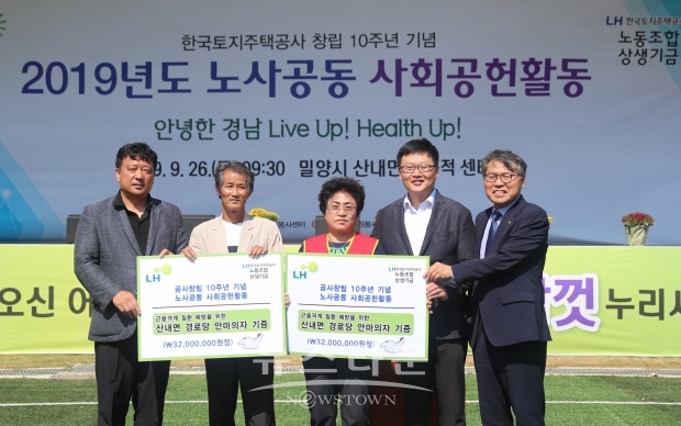 LH(사장 변창흠)는 26일 밀양시, 경남 및 밀양자원봉사센터, 산내면 주민 등 350여명과 함께 밀양시 산내면 다목적센터 운동장에서 ‘안녕한 경남 만들기, LH와 함께 Live Up! Health Up!' 노사공동 봉사활동을 실시했다고 밝혔다.