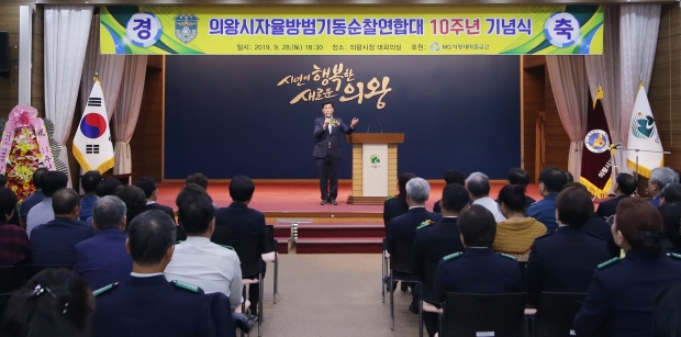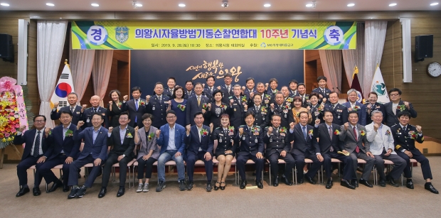 의왕시 자율방범기동순찰연합대(연합대장 이경자)는 지난 28일 의왕시청 대회의실에서 김상돈 의왕시장을 비롯해 신창현 국회의원, 윤미근 시의회의장, 시·의원, 내빈 등 300여명이 참석한 가운데 10주년 기념식을 개최했다.
