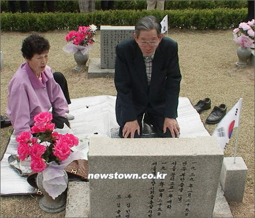 | ^^^▲ 아들의 묘소에서 오열하는 모정19일 오전, 국립4.19민주묘지에서 열린 '제47주년 4.19혁명기념식'이 끝난 후, 아들의 묘소에서 오열하고 있는 모정.. ⓒ 이광윤 보도국장^^^ | ||