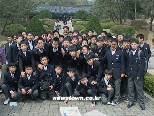 | ^^^▲ 미래의 꿈나무들19일 오전, 국립4.19민주묘지에서 열린 '제47주년 4.19혁명기념식'에 참석한 서라벌중 1학년 9반 학생들이 기념촬영을 하고 있다. ⓒ 이광윤 보도국장^^^ | ||