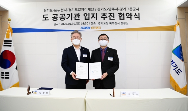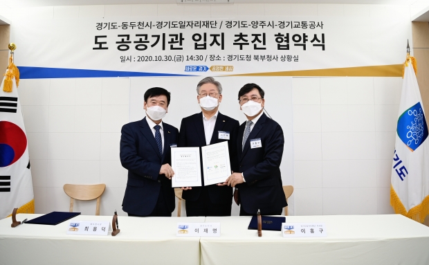 이재명 경기도지사, 최용덕 동두천시장, 이홍구 경기도일자리재단 이사장, 조학수 양주 부시장은 지난 30일 오후 경기도청에서 이런 내용을 담은 ‘경기도일자리재단 및 경기교통공사 입지 추진을 위한 업무협약’에 공동 서명했다.
