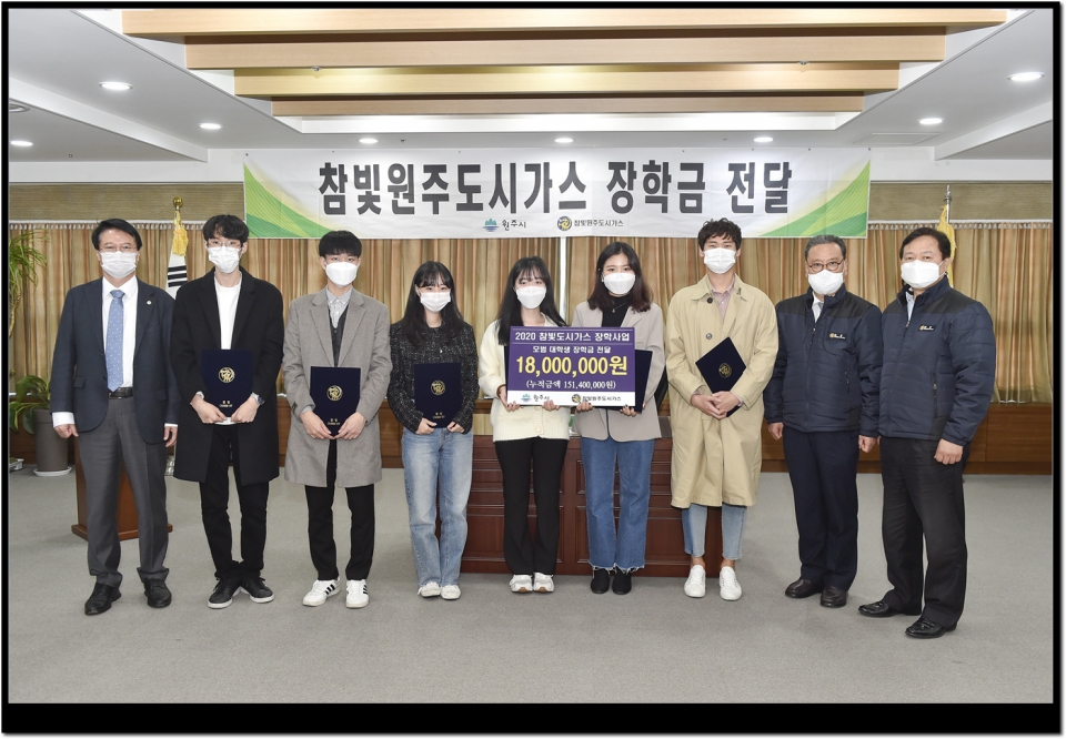 참빛원주도시가스(주)(대표 김문택)는 10일 원주시청 투자상담실에서 원주 출신 대학생 6명에게 1인당 300만 원씩 총 1,800만 원의 장학금을 전달했다.