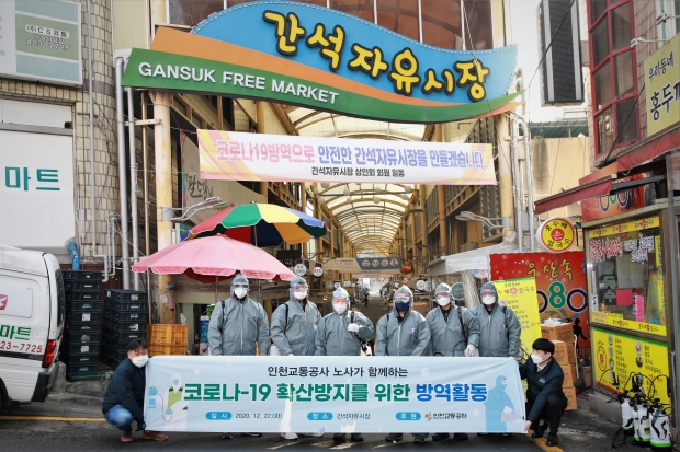 인천교통공사(사장 정희윤)는 22일 코로나19 확산 방지를 위해 자매결연 전통시장인 간석자유시장을 방문하여 노사가 공동으로 소독방역 봉사활동을 전개했다고 밝혔다.