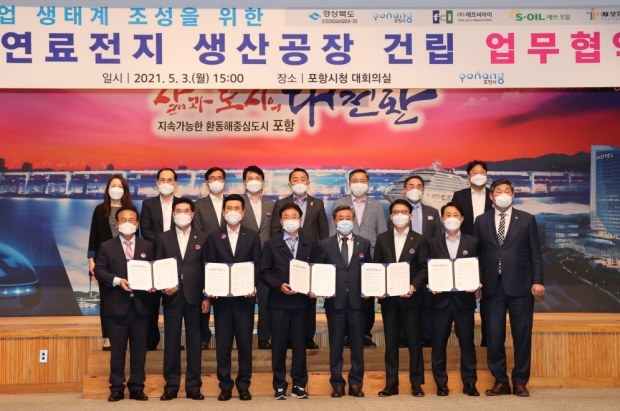 포항시는 3일 시청 대회의실에서 경상북도, ㈜에프씨아이, 에쓰오일㈜, 포항테크노파크 등 5개 기관이 함께 ‘수소연료전지산업 육성을 위한 연료전지 생산공장 건립 업무협약’을 체결했다.