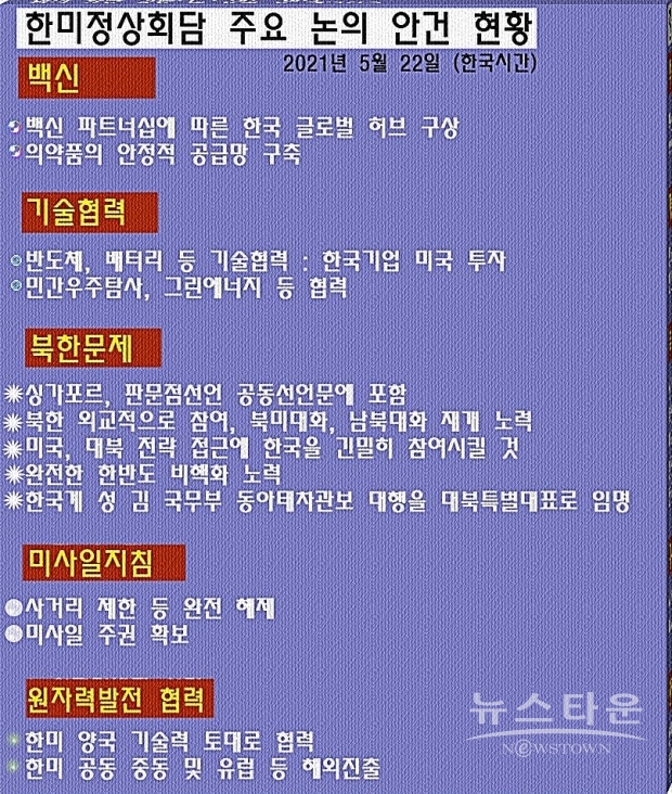 문재인 대통령은 21(현지시간) 조 바이든 미국 대통령과 첫 대면 정상회의를 백악관에서 갖고, 백신 확보 문제, 양국 간 기술협력, 북한 문제, 미사일 지침, 원자력발전 협력 등에 대해 합의했다.