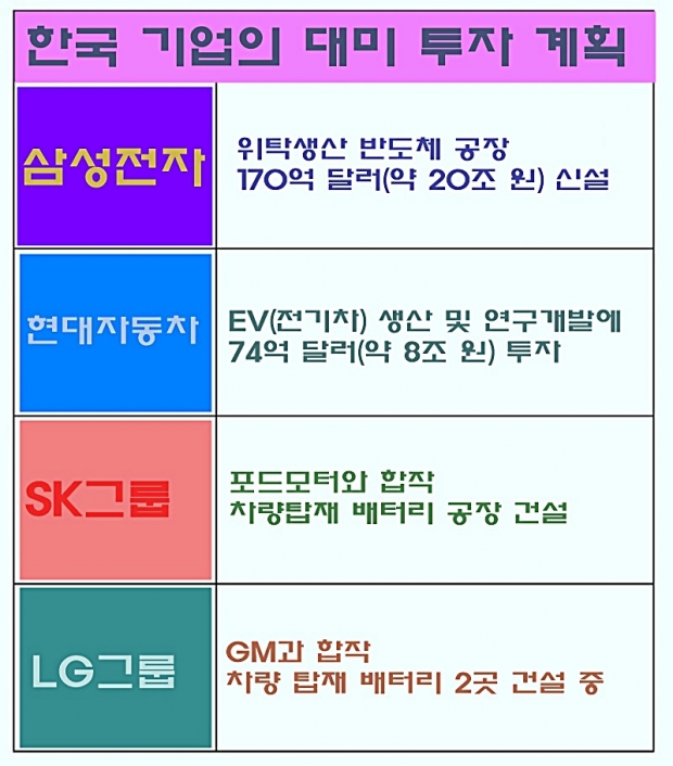 21일 한국 정부가 발표한 한국 기업의 대미 투자 계획의 최대 핵심은 삼성의 반도체 신설 공장이다. 170억 달러(191,675억 원)를 투자를 할 계획으로 주로 미국의 패브레스(fabless) 반도체 메이커로부터 생산을 하청 받는다고 일본의 니혼게이자이(일본경제신문)22일 보도했다.