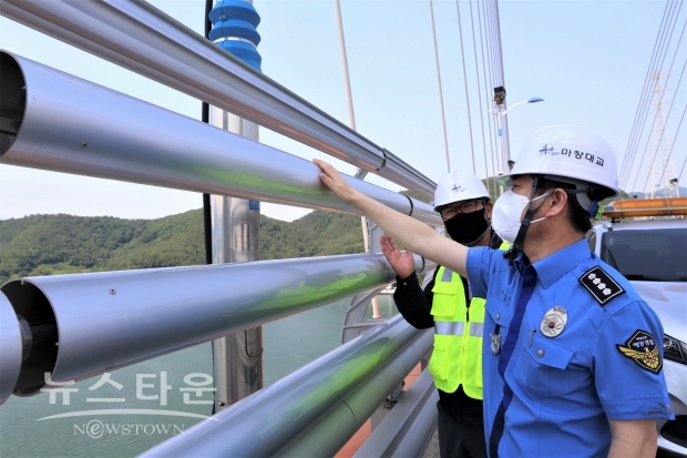 유충근 서장은 마창대교 관리사무소를 방문해 교통정보센터 감시체계를 확인하고, 마창대교에 설치된 투신방지 안전난간(롤린더 시스템)을 현장점검했다.