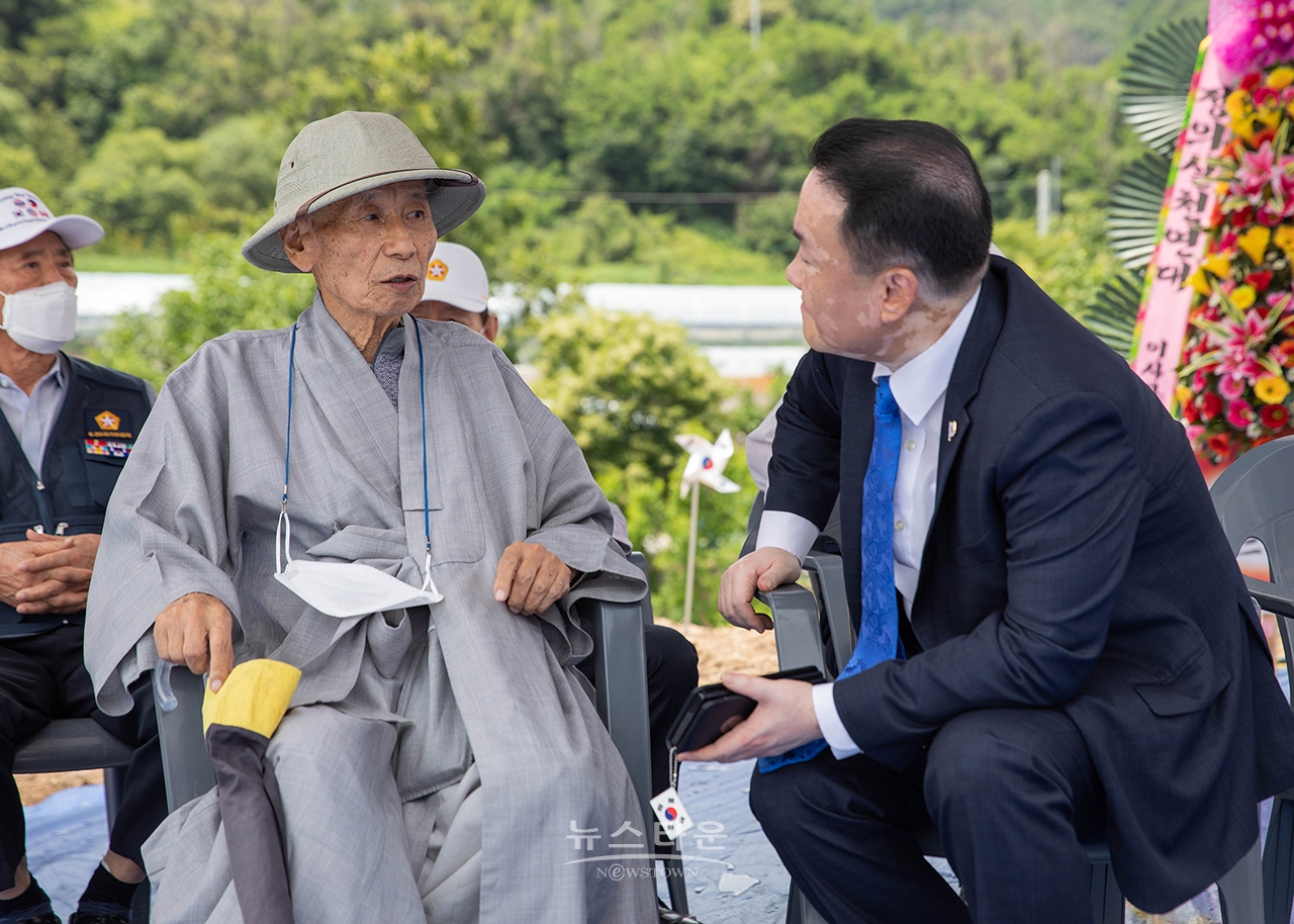 문재인 父 문용형 북한군 군관 생포 증언한 학도병 윤월 스님과 (주)뉴스타운 부설 학도병기념사업회 손상윤 회장.