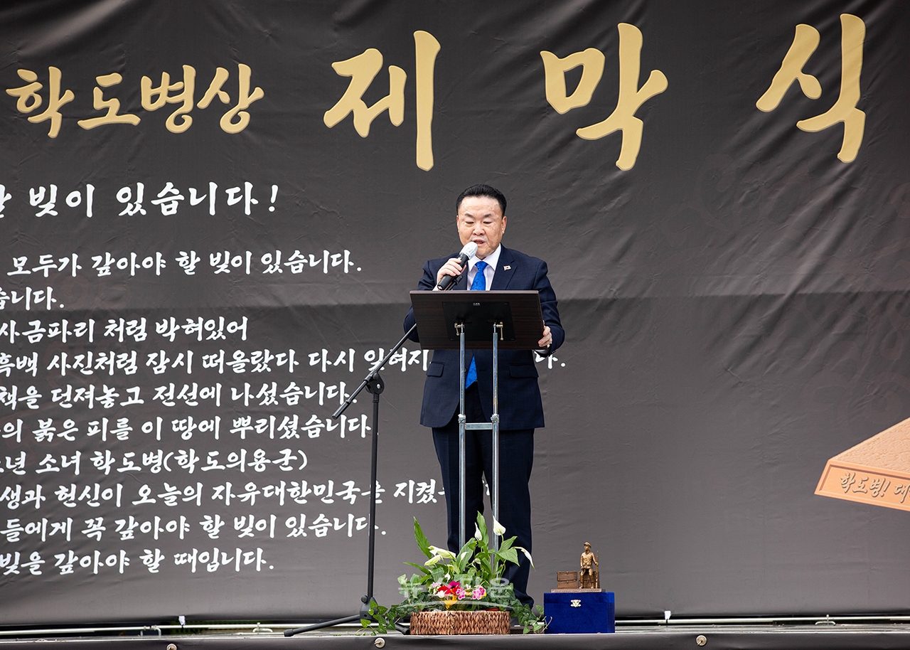 '자유의 호국 학도병상' 제막식 기념사 및 인사말을 하고 있는 (주)뉴스타운 부설 학도병기념사업회 손상윤 회장.