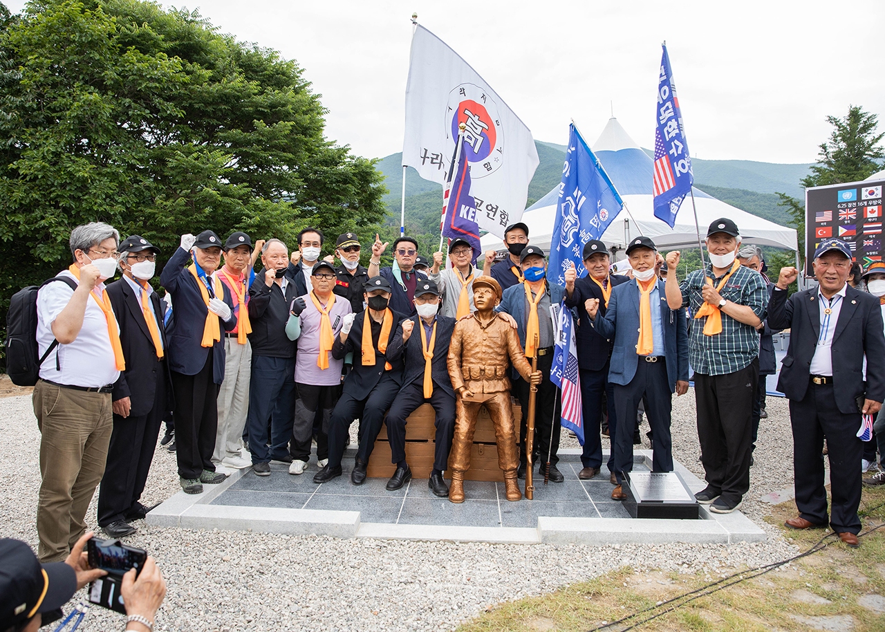 '자유의 호국 학도병상'과 기념 촬영하는 학도병들과 주요 참석자들.