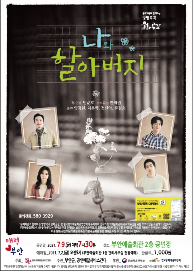 부안군은 한국문화예술회관연합회가 주최하고 문화체육관광부가 후원하는 ‘2021 문예회관과 함께하는 방방곡곡 문화공감사업’ –민간예술단체 우수공연 프로그램- ‘나와 할아버지’ 공연을 7월 9일 펼친다고 밝혔다.