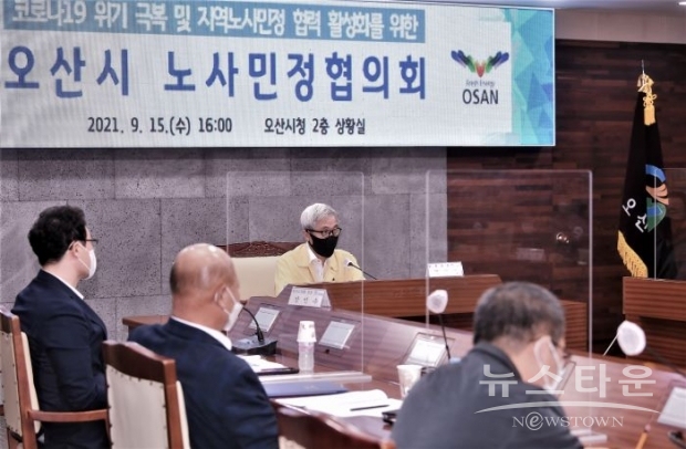 경기 오산시(시장 곽상욱)가 지난 15일 시청 상황실에서 노사민정협의회를 개최하고 코로나19 극복을 위한 노사민정 공동선언문을 채택했다.
