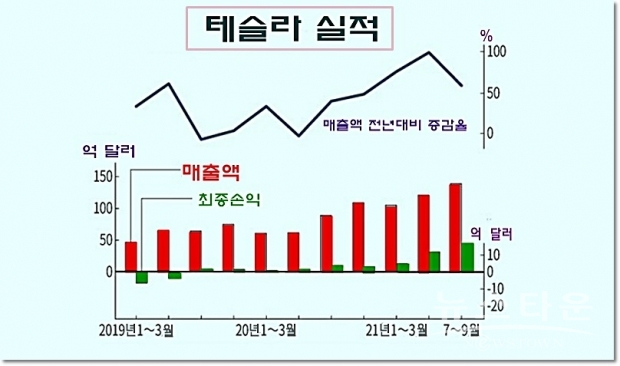 미국의 테슬라(Tesla)가 20일(현지시간) 발표한 2021년도 3분기(7~9월) 결산은 매출액이 지난해 같은 기간 대비 57% 증가한 137억 5천 700만 달러(약 16조 1,700억 원), 순이익은 4.9배인 16억 1800만 달러(약 1조 9,018억 원)였다.