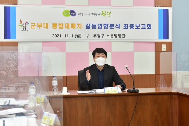 부평구(구청장 차준택)는 지난 1일 영상회의실에서 지역 내 군부대 통합재배치의 갈등관리 전략 수립을 위한 갈등영향분석 최종보고회를 열었다.