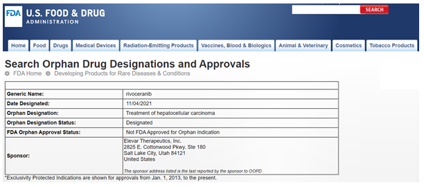 <미국 FDA가 리보세라닙을 간암에 대한 희귀의약품으로 지정했다. FDA 홈페이지>