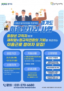 한편, 재단은 이음 일자리 선발자를 대상으로 직무역량 강화를 위해 사전 직무역량교육(OJT)을 실시하고, 선정기업에 이음근로자의 고용유지 유도를 위해 직무관련 교육을 지원할 계획이다. 사업 및 참여자 모집에 대한 자세한 사항은 경기도일자리재단 중장년일자리센터(031-270-6680)로 문의하면 된다.