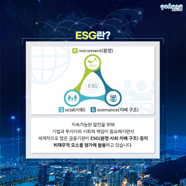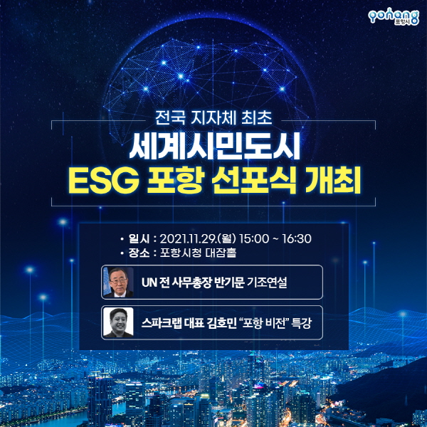 포항시는 오는 29일 전국 지자체 최초로 ‘세계시민도시 ESG 포항’ 선포식을 시작으로 ‘ESG 선도도시’로 도약하고자 한다.