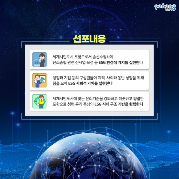 이강덕 포항시장은 “‘ESG 포항’은 지속발전 가능한 더 큰 포항을 완성시키기 위한 포항시의 야심찬 프로젝트로 이번 ‘세계시민도시 ESG 포항 선포식’을 시작으로 현재의 발전을 미래에 지속하기 위한 미래 세대와의 소통과, ESG 경영 마인드 교육 및 창업생태계 기반 등을 확충해 포항시민 여러분들과 함께 ESG 가치를 실현시킬 수 있는 정책과 행정에 최선을 다할 것”이라고 밝혔다.