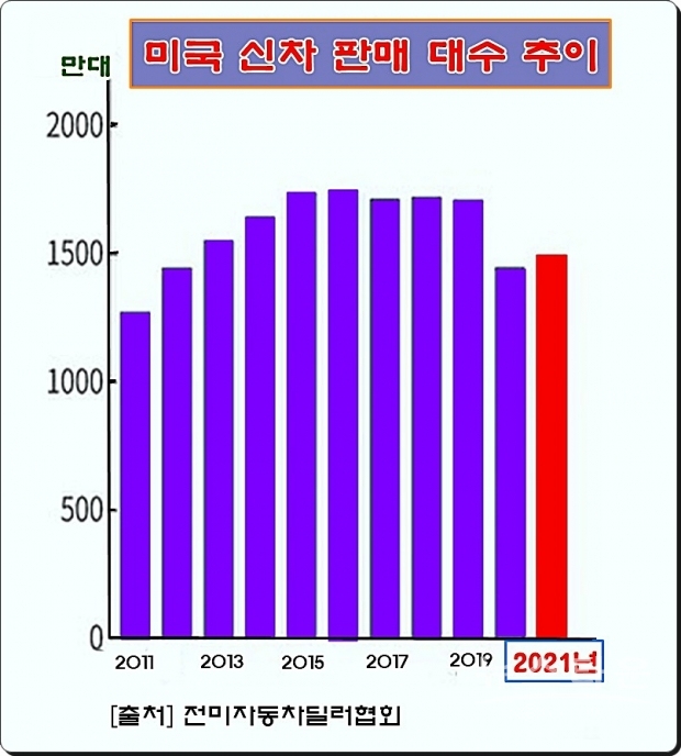 미국 신차 판매는 2019년까지 1,700만대 규모로 추이해왔다. 신종 코로나 바이러스위기로 판매점이 일시 판매 중지에 몰린 2020년은 1,447만대로 크게 위축 됐었다. NDAA2021년 초 신종 코로나 위기의 여파가 아직도 남아있어, 그해 판매가 1,550만대에 그칠 것으로 예상되었지만, 반도체 부족에 따른 감산의 여파로 당초 예상을 밑돌았다.