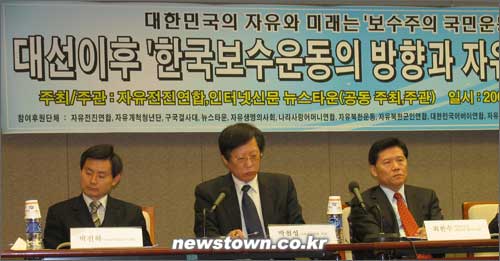 희망이 가득찬 듯, 눈이 내리는 가운데 22일 오후 2시 프레스 센터에서는 "뉴스타운"과 "자유전진연합"이 공동 주체, 주관한 "대선 이후 '한국 보수운동의 방향과 자유신당의 정체성'에 관한 토론회"가 열렸다.