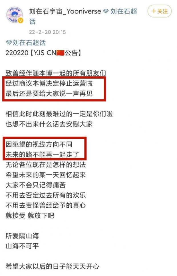 “바라보는 방향이 달라 앞으로의 길을 더 이상 함께 갈 수 없습니다. 국가 앞에 ‘우상’이라는 두 글자는 중요치 않습니다” 유재석의 중국 팬카페가 20일 저녁 폐쇄한다는 발표를 하면서 올린 글<사진>이다.