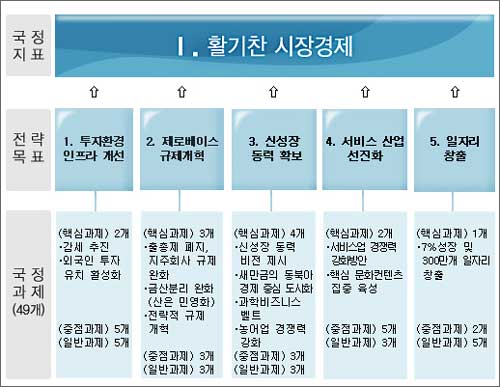 활기찬 시장경제 국정지표는 ▲투자환경 인프라 개선 ▲제로베이스 규제개혁 ▲신성장 동력 확보 ▲서비스 산업 선진화 ▲일자리 창출을 전략목표로 하고 있다.