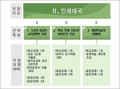 인재대국 국정지표는 ▲수요자 중심의 교육경쟁력 강화 ▲핵심 인재 양성과 과학한국 건설 ▲평생학습의 생활화를 전략목표로 한다.