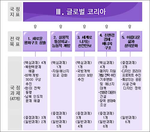글로벌 코리아 국정지표의 5대 전략은 ▲새로운 평화구조 창출 ▲실용적 통상외교 ▲능동적 개방 ▲세계로 나가는 선진안보 ▲친환경 경제·에너지 구조 ▲아름다운 삶과 창의문화 등이다.