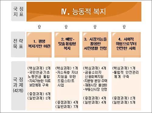 능동적 복지 국정지표의 4대 전략은 ▲평생 복지기반 마련 ▲예방·맞춤·통합형 복지 ▲시장기능을 활용한 서민생활 안정 ▲사회적 위험으로부터 안전한 사회 등이다.