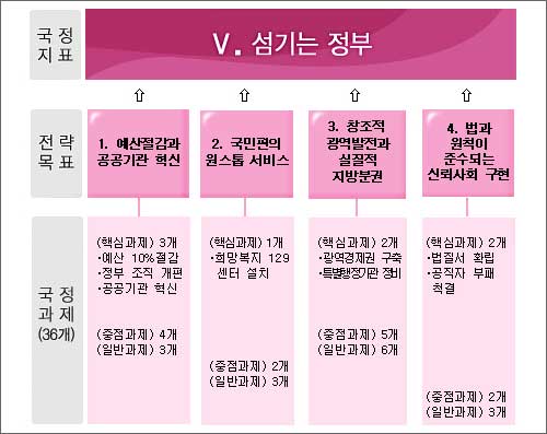 섬기는 정부 국정지표는 ▲예산절감과 공공기관 혁신 ▲국민편의 원스톱 서비스 ▲창조적광역발전과 실질적 지방분권 ▲법과 원칙이 준수되는 신뢰사회 구현을 전략목표로 한다.