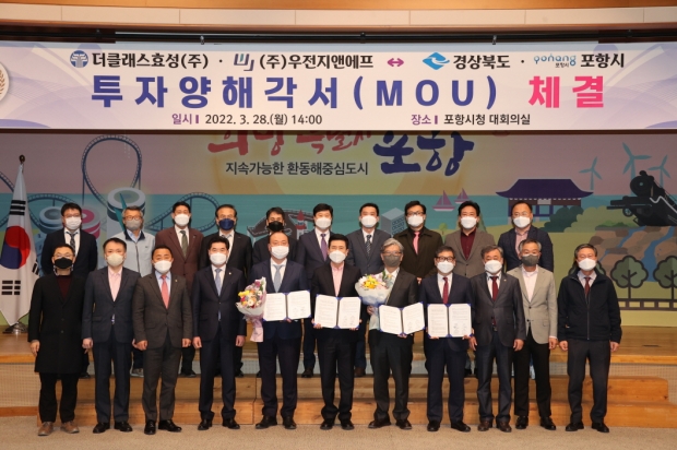 포항시는 28일 시청 대회의실에서 포항시와 경상북도, 더클래스효성㈜과 ㈜우전지앤에프 간 투자양해각서(MOU)를 체결하고, ㈜우전지앤에프가 영일만3 일반산업단지 내 이차전지 소재 분야 제조 공장 건립을 추진할 계획이라고 밝혔다.
