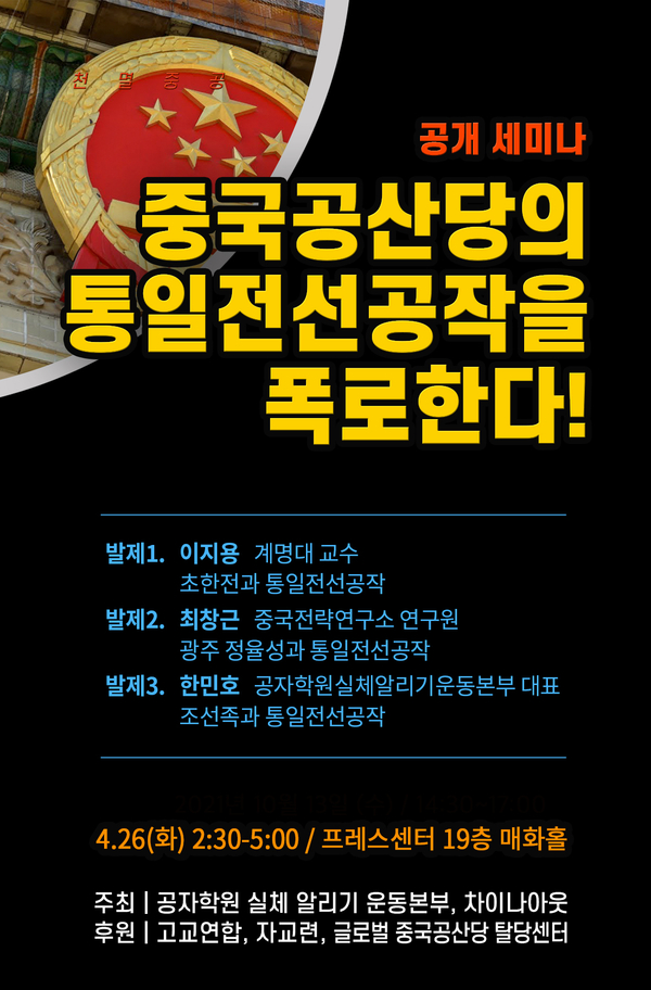 시민단체 <공자학원 실체 알리기 운동본부>(이하 ‘공실본’)와 <차이나아웃>은 26일 프레스센터에서 “중국공산당의 통일전선공작을 폭로한다!” 공개 세미나를 개최한다.