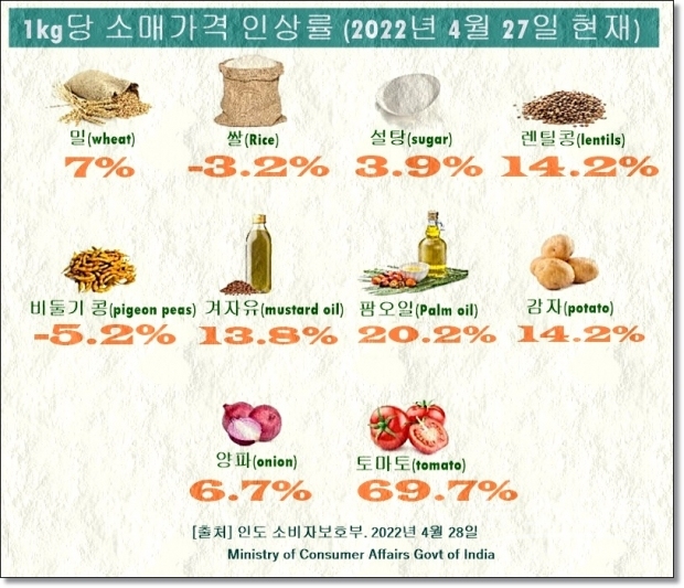 그 결과는 상당히 큰 덩어리에게는 파괴적일 수 있는데, 인도인 10명 중 6명은 국가에서 제공하는 보조 식품에 의존하고 있다. 곡물 인플레이션은 빵, 가금류, 우유에서부터 비스킷, 맥주까지 일상용품을 만들겠다고 위협하는 밀, 옥수수, 보리 등의 가격 상승으로 인해 역풍을 맞을 것으로 보인다. 소비자 지갑의 타격은 주로 인도의 수입 의존도가 높은 식용유 가격 상승에 더하여 올 것이다.