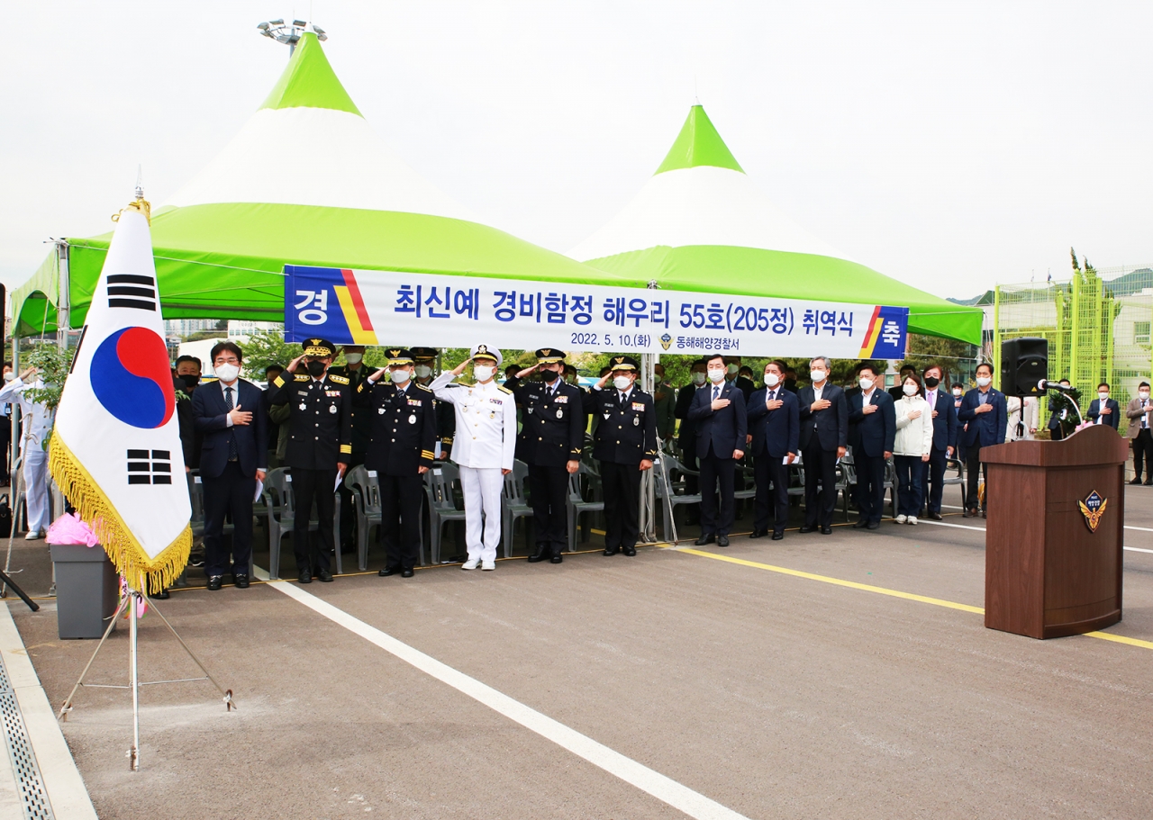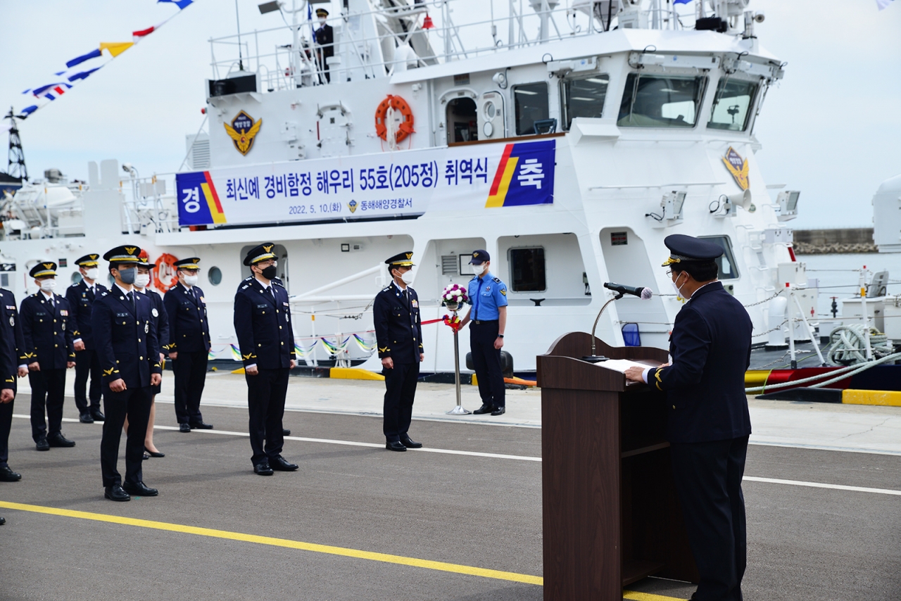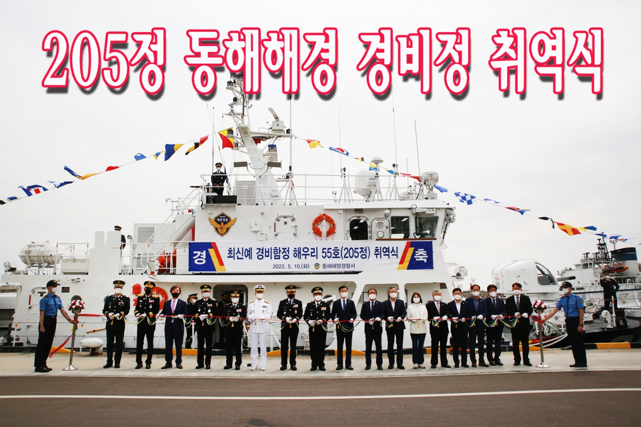 동해해양경찰서는 10일 묵호항 전용부두에서 최신예 경비정인 205정(해우리55호)의 취역식 행사를 가졌다고 밝혔다.