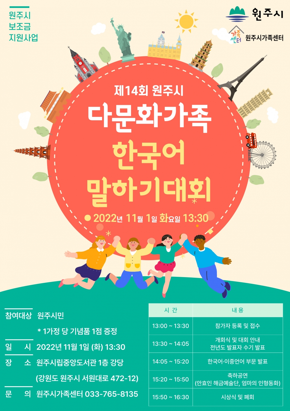 원주시가족센터(센터장 남궁은임)는 오는 11월 1일 오후 1시 30분 원주시립중앙도서관 1층 강당에서‘제14회 원주시 다문화가족 한국어 말하기대회를 개최한다.