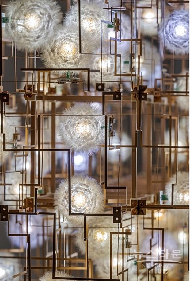 이번 전시에서는 드리프트의 이와 같은 작품 세계를 고스란히 살펴볼 수 있는 4개의 시리즈를 선보인다. 먼저 천정에 매달은 구조물의 움직임을 통해 꽃봉오리의 개화 과정을 표현한 ‘샤이라이트(Shylight)’를 비롯해, 스무쌍의 유리관을 이용해 하늘을 나는 새의 날갯짓을 재해석한 ‘앰플리튜드(Amplitude)’, 민들레 1만5000 송이를 건조해 각각을 LED 전구에 붙여 완성한 조명 작품 ‘프래자일 퓨처(Fragile Future)’, 그리고 생명체나 사물을 해체해 이들을 재료와 소재로 재구성해 보여주는 ‘머테리얼리즘(Materialism)’ 등이다.