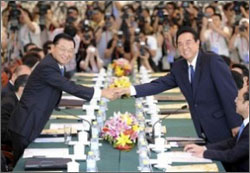 | ^^^▲ 중국 해협회 천원린(陳云林) 회장(오른쪽)과 장빙쿤(江丙坤) 대만 해기회 이사장이 역사적인 양안간 대화 테이블에서 악수하고 있다. ⓒ Xinhua news agency^^^ | ||