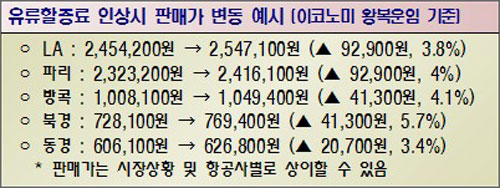 | ^^^^^^▲ 고유가 상황이 지속됨에 따라 국제선 항공료 3~5% 인상한다.^^^^^^ | ||