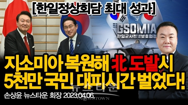 6일 오전 손상윤 뉴스타운 회장은 자유미래TV에서 '[한일정상회담 최대성과] 윤석열 대통령 지소미아 복원해 북한 핵미사일 도발시 5천만 국민 대피시간 벌었다!'라는 제목으로 방송을 진행했다.