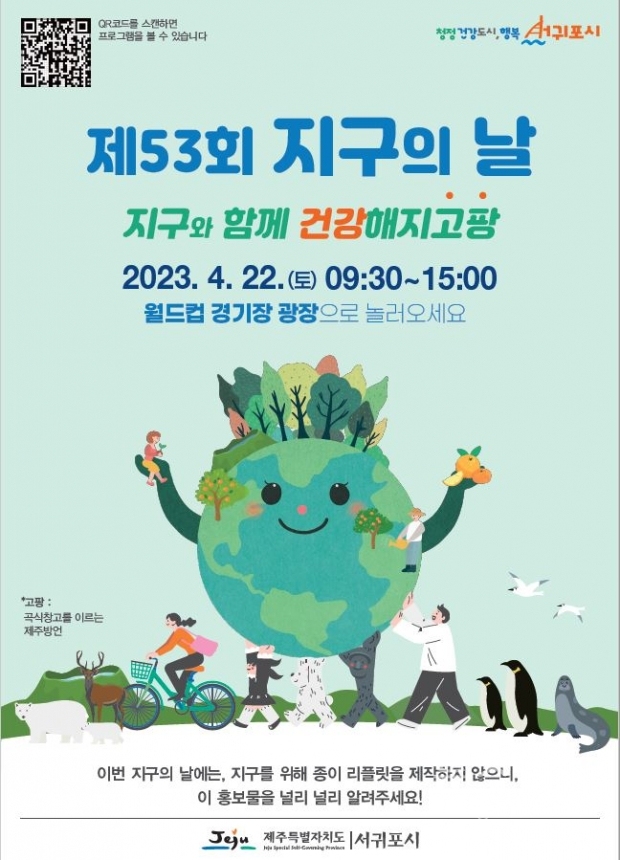 서귀포시(시장 이종우)와 서귀포시지속가능발전협의회(회장 오창순)는 오는 4월 22일 제53회 지구의 날을 맞아 제주 월드컵경기장 광장에서 ‘지구와 함께 건강해지고팡’을 주제로 축제를 연다.
