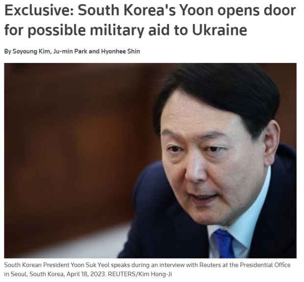 윤 대통령과 인터뷰를 가진 로이터 통신은 “한국 정부가 우크라이나에 대한 무기제공 의향을 나타낸 것은 개전(開戰) 1년여 만에 처음”이라고 보도했다.