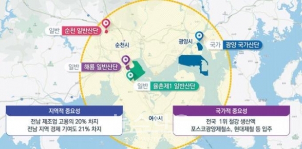 먼저 전남 광양국가산업단지는 율촌제1일반산단, 순천일반산단, 해룡일반산단을 연계하여, 저탄소 공정혁신과 디지털 전환을 통한 “다시 도약하는 미래 철강 산업단지”를 비전으로 제시하였다. 이를 위해 철강산업 저탄소 기술개발, 스마트산단 제조혁신 기반 구축, 기반시설 재정비 및 아름다운 거리 조성, 스마트 물류플랫폼 구축 등 사업을 통해 온실가스 저감, 스마트공장 증설, 청년고용률 상향 등을 목표로 설정하였다.