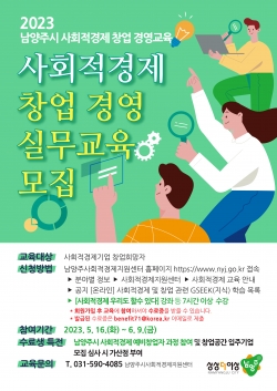남양주시는 오는 6월 20일부터 7월 28일까지 남양주시 사회적경제 지원센터에서 ‘2023 남양주시 사회적경제 창업 경영 실무교육 과정’을 주 2회 총 10차시로 운영한다고 2일 밝혔다.