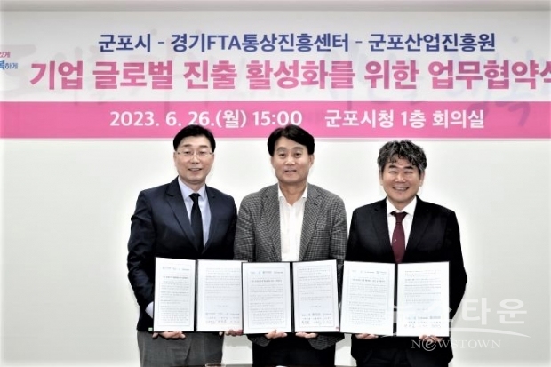 군포시는 지난 26일 경기FTA통상진흥센터, 군포산업진흥원과 관내 중소기업의 수출 저변확대를 위한 업무협약을 맺었다.