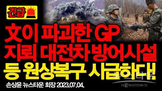 4일 오전 손상윤 뉴스타운 회장은 "文이 파괴한 GP 지뢰 대전차 방어시설 등 원상복구 시급하다!" 라는 제목으로 자유미래TV에서 생방송을 실시했다.