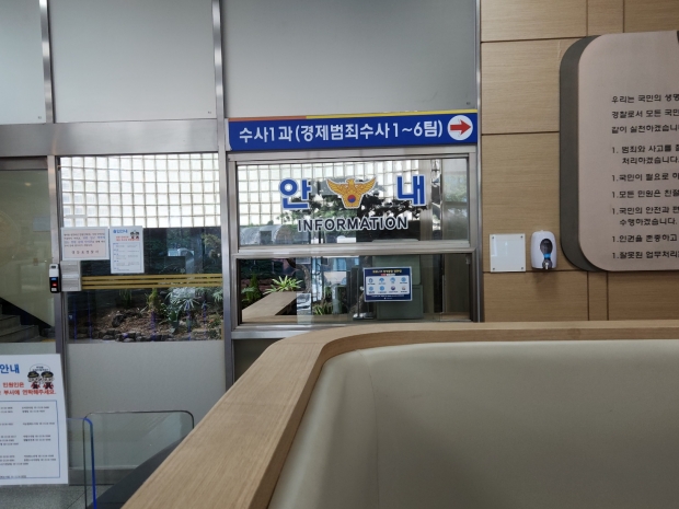 영등포경찰서 본관의 텅빈 안내소 근무자 무존재다.