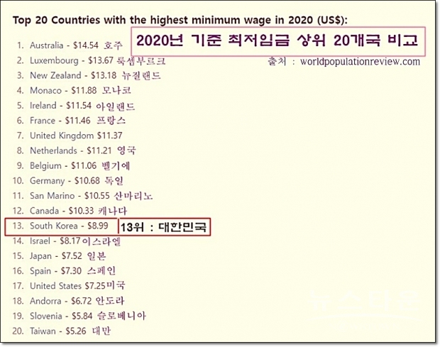 한편, 지난 2020년 기준 한국은 세계 최저임금 주요국 랭킹에서 13위를 차지했다. (아래 표 참조)