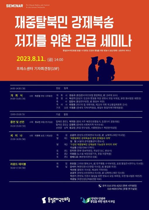 통일준비국민포럼과 한반도인권과통일을위한변호사모임은 오는 11일 오후 2시 프레스센터 기자회견장 19층에서 ‘재중 탈북민 강제 북송 저지를 위한 긴급 세미나’를 공동 개최한다.