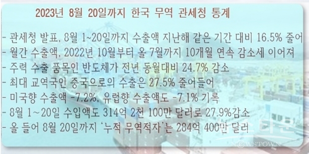 한편, 올 1월 1일부터 8월 20일까지 누적 무역적자는 284억 400만 달러로 집계됐다.