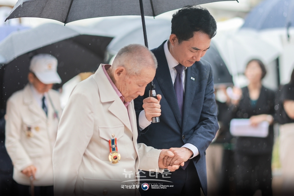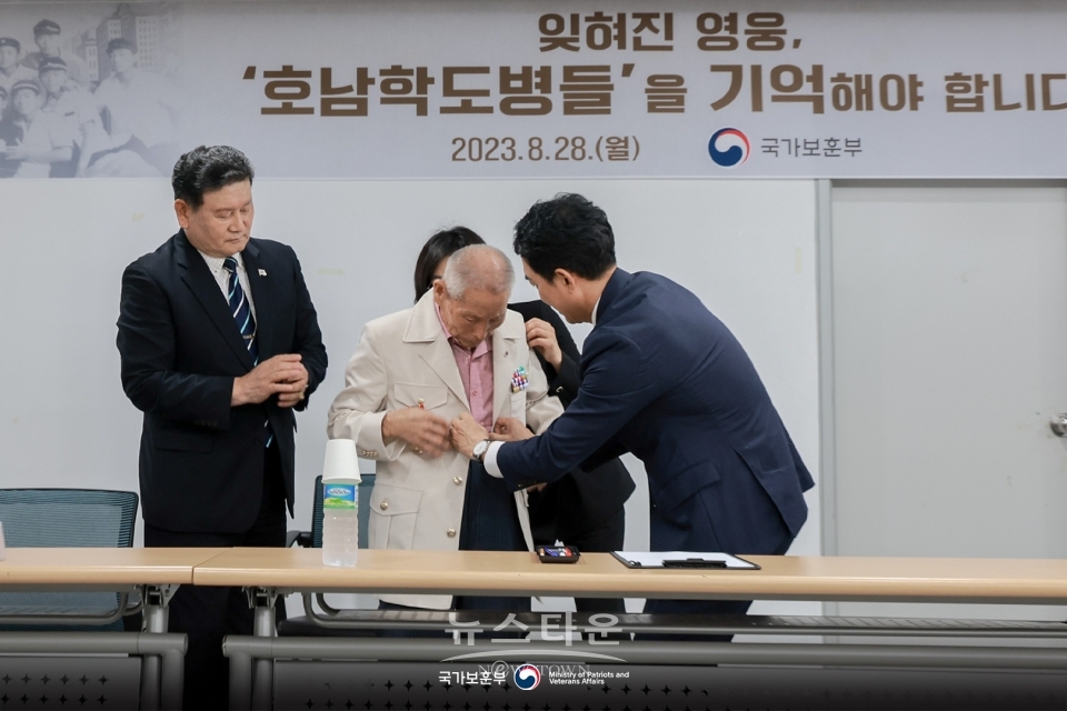 박 장관은 이날 호남학도병 출신 고병현(94) 옹에게 감사의 마음을 담아 '영웅의 제복'을 전달했다. 고병현 옹은 1950년 율촌고등공민학교 재학 중 군입대를 거부당하자, 혈서를 제출한 끝에 학도병으로 입대한 호국 영웅이다.